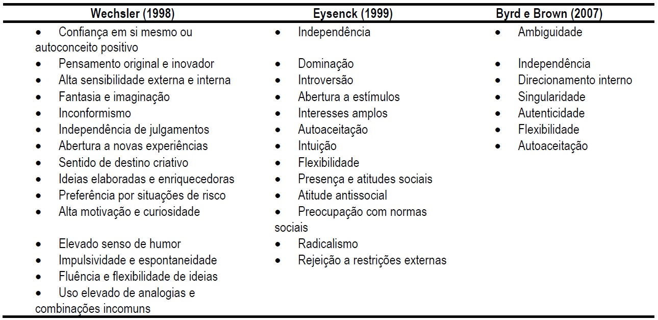 Diversos estudos já foram realizados nesse âmbito no intuito de extrair traços de personalidade comuns que pudessem explicar os momentos de inspiração criativa (de Alencar, 1995). Nesses estudos, o que se pode observar é que, dependendo da área em que o indivíduo criativo estava inserido, as características variam. Para ilustrar tais divergências de características, lista-se, na Figura 2, os conjuntos de traços de personalidades conferidos às pessoas criativas, segundo Wechsler (1998), Eysenk (1999) e Byrd e Brown (2007), citado por Monteiro Jr (2011). Dentre estes, apenas três traços são comuns, independência, autoaceitação e flexibilidade.
