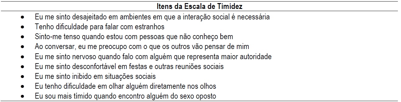 Embora existam várias proposições diferentes para mensurar a ansiedade social, por muito tempo não se identificava alguma maneira de avaliar, especificamente, a timidez. Nesta lacuna, Cheek e Buss (1981) construíram uma escala utilizando três critérios: (1) critério afetivo (tensão, preocupação); (2) componentes instrumentais (comportamento desajeitado, aversão aos olhares); (3) exclusão de qualquer referência à preferência de estar com outras pessoas, para evitar viés de pesquisa, conforme descritos na Figura 3.