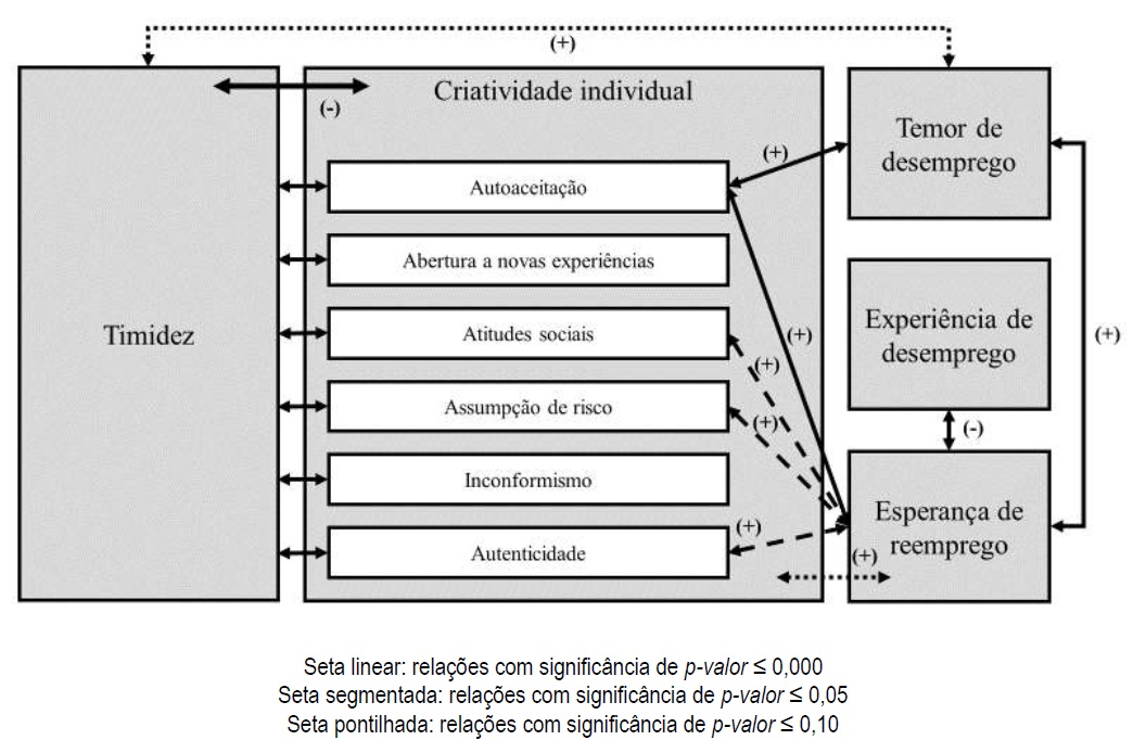 Contudo, ao se analisarem os fatores formativos de criatividade individual percebida, algumas informações são instigantes a novas pesquisas. Por exemplo, quanto maior a autoaceitação, sociabilidade e autenticidade do indivíduo, menor é o temor em ficar desempregado, levando a crer que pessoas com mais autoestima, interação social e autenticidade percebem em si condições de se reposicionarem profissionalmente com mais facilidade que as demais, apontando caminhos para equacionar alternativas relacionadas à timidez na formação profissional e os sentimentos dela decorrentes.