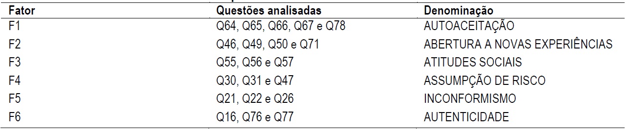 Considerando as variáveis observáveis (. < 0,01), foram identificados seis fatores correlacionados entre si, que correspondem a 60% do construto criatividade individual percebida. Os fatores foram denominados de acordo com a interpretação do conjunto de questões que se agruparam, por fator.