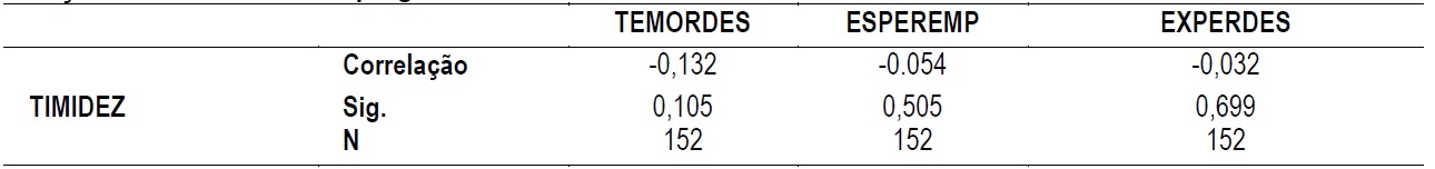 Em relação à amostra, a timidez não possui relação com a experiência de desemprego do indivíduo, nem como a esperança de reemprego, porém exibe alguma significância em relação ao temor de ficar desempregado, conforme a Tabela 5, numa relação inversa. Portanto, há evidência, na amostra, que os mais tímidos temem menos uma situação de desemprego (β = -0,127; p < 0,105).
