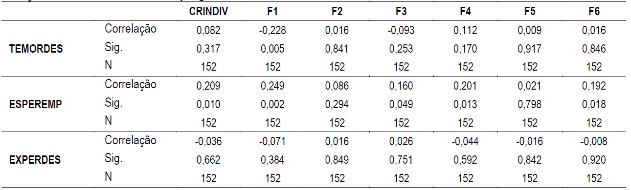 Em relação às variáveis de controle, comparadas à variável subjetiva de temor de ficar desempregado (TEMORDES), pode-se observar que a variável renda apresentou correlação baixa (β = 0,137; . < 0,093). Igualmente, os indivíduos com maior idade também tem maior temor ao desemprego (β = 0,150; . < 0,065). As variáveis gênero e formação educacional não foram significantes em relação ao temor ao desemprego. Foi analisada, também, a relação entre as variáveis de controle e a esperança de reemprego (ESPEREMP) e verificou-se que indivíduos com maior renda são mais esperançosos de reconquistar emprego (β = 0,192; . < 0,018) e que as demais variáveis de controle, idade, gênero e formação profissional não foram significantes.