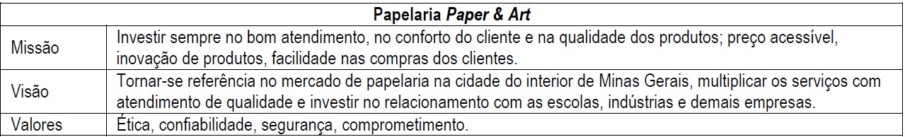 Nesses nove anos de papelaria, a empresa solidificou seu espaço no mercado, está situada em umas das principais avenidas da cidade. Busca constantemente atender todos os tipos de clientes e possíveis consumidores abrangendo em seu leque estudantes, empresários, crianças, escolas, entre outros. Desde sempre a papelaria se apoiou em duas características conhecidas como muito importantes: estar sempre atualizada com as tendências e novidades do mercado; e garantir o respeito aos seus clientes. Tais atributos são sintetizados na descrição da missão, visão e valores da empresa, descritas na Figura 1.