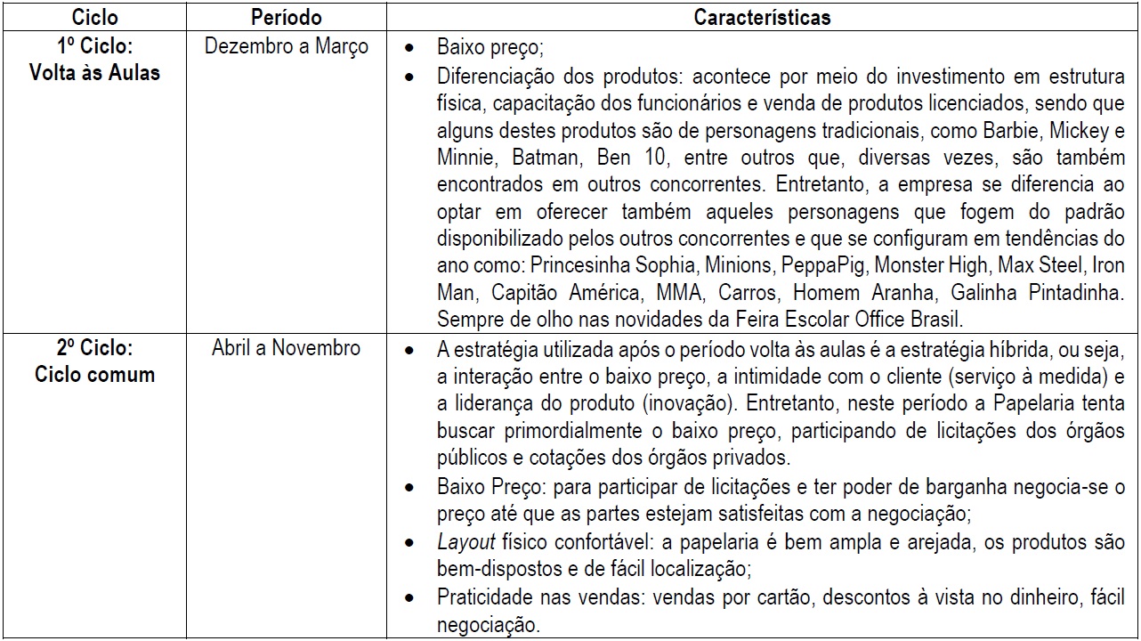 No período de volta às aulas, que se estende de dezembro a março de cada ano, a papelaria faz a utilização da estratégia de diferenciação, que se caracteriza pelo investimento na imagem, na estrutura e layout da empresa, na capacitação, mesmo que pouca, dos funcionários para o atendimento e ambiente agradável ao cliente. Nessa época, investe-se em diferenciação em relação aos outros concorrentes, oferecendo produtos e serviços não comuns, visto que, nessa época, são muitos os comércios que aproveitam da sazonalidade do mercado para oferecer também produtos escolares. Tais estabelecimentos são apelidados “carinhosamente”, dentro da empresa, de “oportunistas ou paraquedistas”, pois só comercializam produtos de papelaria nessa época.