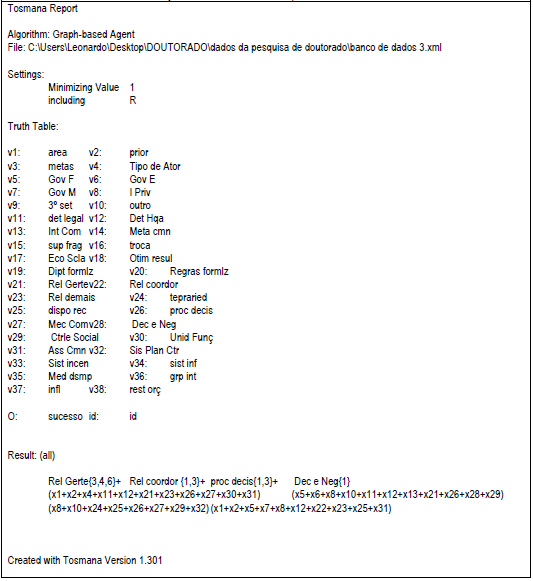A primeira forma de análise envolveu a utilização do software TOSMANA na análise qualitativa comparativa, para obtenção de equações lógicas[9] que apresentam as condições necessárias ou suficientes para um determinado resultado selecionado pelo pesquisador (sucesso ou insucesso na implementação).