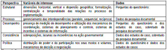 Foram definidas nove variáveis condition, que descrevem caráter da coordenação interorganizacional, e uma variável resultado outcome, sendo que esta última teve parâmetro intencionalmente fixado. A estrutura analítica também serviu como base para a elaboração dos códigos utilizados no processo de análise documental e de entrevistas relativas a cada um dos casos estudados.