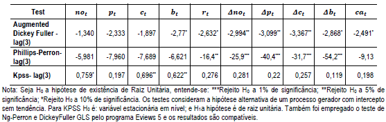 Os resultados para o Teste de Raiz Unitária pelos métodos Dickey Fuller Aumentado, Phillips-Perron e KPSSestão representados no Apêndice A. De forma geral, os resultados apontam que as variáveis em nível𝑛𝑜𝑡, 𝑝𝑡 , 𝑐𝑡 , 𝑏𝑡 apresentam Raiz Unitária, mas são estacionárias em primeira diferença. Para as séries da conta correntee taxa de juros, parte das estatísticas obtidas leva a rejeitar a Raiz Unitária, sendo que para a conta corrente isso ocorreapenas a 10% de significância para o teste Dickey Fuller Aumentado, e não se rejeita a hipótese de estacionariedadepara o teste KPSS.