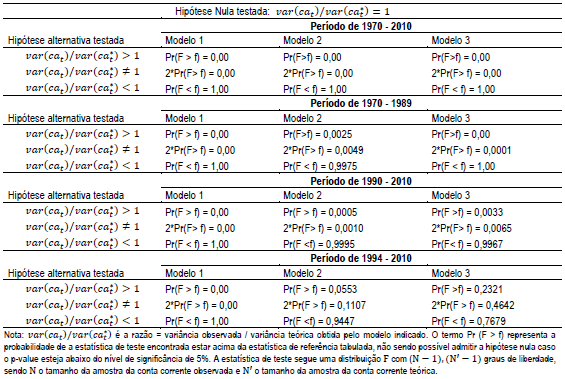 Para auxiliar na análise, o Apêndice B apresenta os resultados do teste da Razão da Variância, que confronta a Hipótese Nula de que a razão é igual a 1 contra as Alternativas de que a Razão seja maior, diferente e menor do que 1. Para o Modelo 3, o estudo dos subperíodos mostra que a razão entre as variâncias observada e teórica é superior a 1, independentemente do período. Entretanto, o teste da razão não permite rejeitar a hipótese nula em favor de qualquer das alternativas para o subperíodo 1994-2010. Portanto, é estatisticamente possível admitir que a razão entre as variâncias seja igual a 1, o que põe de lado a afirmação sobre o excesso de mobilidade a partir de 1994. Considerando todas as hipóteses assumidas para a construção do Modelo 3, o Teste da Razão entre as variâncias permite dizer que a conta corrente brasileira funcionou como suavizadora de consumo no período de 1994 a 2010[6].