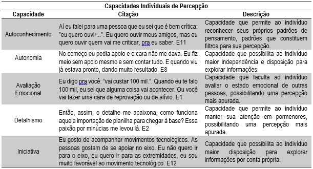 Considerando, inicialmente, as capacidades individuais de percepção como aquelas que se associam às crenças e às expectativas pessoais e que possibilitam ao indivíduo interpretar e comparar dados de modo a identificar oportunidades para novos negócios (Helfat & Peteraf, 2015; Mahringer & Renzl, 2018; Alvarenga & Costa, 2019), os sujeitos participantes deste estudo exploram as capacidades individuais de percepção descritas e evidenciadas na Figura 2.