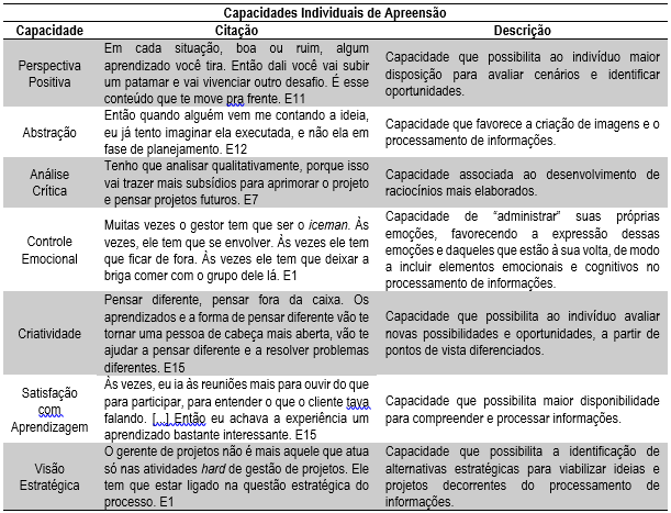 Trata-se de capacidades individuais de apreensão (Figura 3), cujas análises demonstram a presença de elementos cognitivos e emocionais, no processamento de informações. Tais elementos foram apontados por Hodgkinson e Healey (2011) como relevantes para a geração de comprometimentos individuais com novas propostas organizacionais.