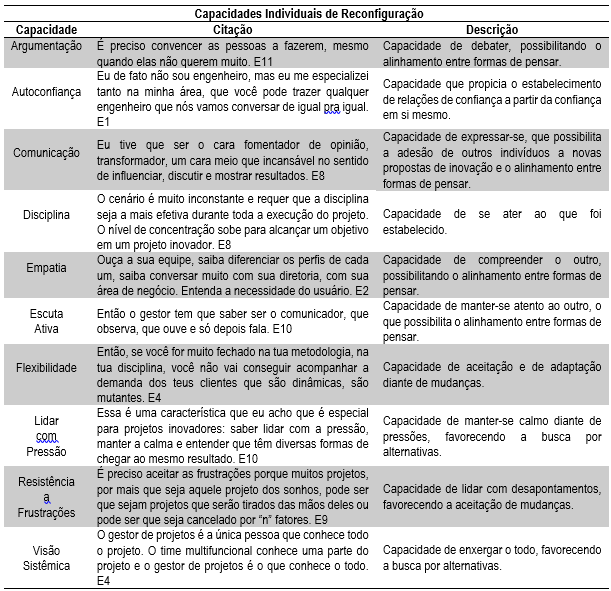 De maneira semelhante, as capacidades individuais de reconfiguração descritas e evidenciadas pelos sujeitos sociais, apresentadas na Figura 4, foram discutidas com base no entendimento de que essas capacidades se pautam nos processos comunicacionais e propiciam a adesão a novas propostas de inovação, o alinhamento entre formas de pensar, o estabelecimento de relações de confiança, a transferência de informações e a aceitação de mudanças (Helfat & Peteraf, 2015; Salvato & Vassolo, 2018; Mudalige, Ismail, & Malek, 2019).