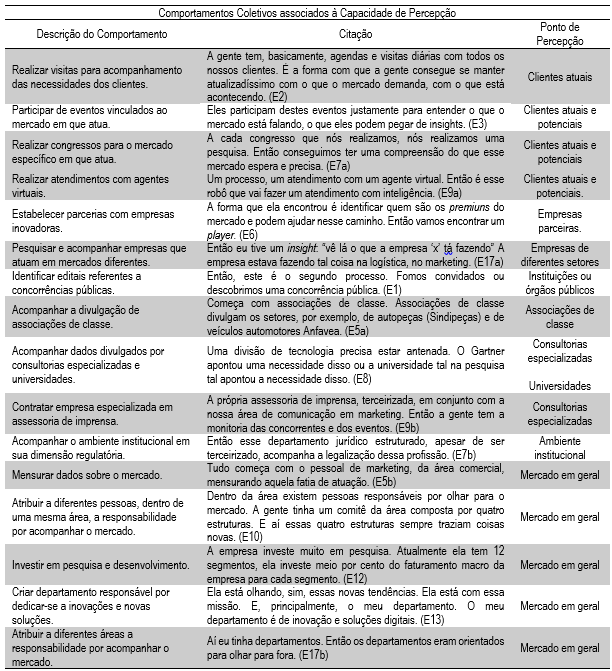 De forma semelhante às capacidades individuais, esses comportamentos coletivos também se associaram às capacidades organizacionais de percepção, tendo clientes atuais e potenciais, empresas parceiras e de diferentes setores, instituições ou órgãos públicos, associações de classe, consultorias especializadas, assim como o ambiente institucional e o mercado em geral, como pontos de percepção localizados no ambiente exógeno à organização. Tais comportamentos vincularam-se ainda às capacidades de apreensão nos níveis organizacional, departamental e das equipes, assim como às capacidades de reconfiguração envolvendo aquisições, realinhamentos, descartes e compartilhamento de recursos.