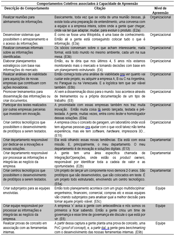De maneira complementar, os comportamentos coletivos associados à capacidade organizacional de apreensão (Figura 5) se vincularam ao planejamento estratégico da empresa (evidenciado por E4), à criação de departamentos (evidenciado por E2b e E13) e de centros tecnológicos (entrevistados E5a e E15), ao estabelecimento de parcerias com empresas que investem em inovação (entrevistado E9a) e à aquisição de novas empresas (E5b).
