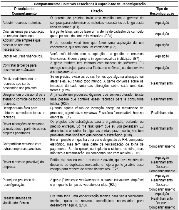 Por fim, os comportamentos coletivos associados à capacidade organizacional de reconfiguração, apresentados na Figura 6, compreenderam desde o planejamento dos recursos necessários para atender às demandas de mercado até o gerenciamento de situações em que esses recursos estavam ou não disponíveis na empresa.
