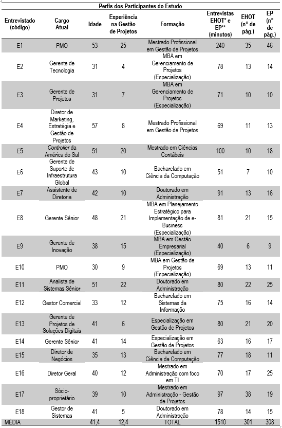 A partir da Tabela 1, identifica-se que os sujeitos sociais da pesquisa tinham, em média, 41 anos de idade, 12 anos de experiência profissional na gestão de projetos e uma formação que varia entre bacharelado e doutorado completos.
