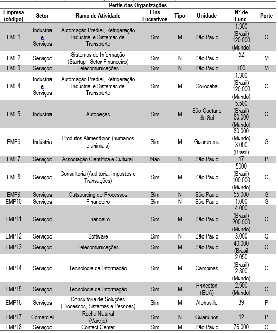 A escolha dos 18 gestores de projetos de inovação como unidade de análise para este estudo, cujos contextos organizacionais de atuação encontram-se descritos na Tabela 1, fundamentou-se nas responsabilidades desses profissionais: (a) por acompanharem as transformações do mercado (Kerzner, 2011), (b) coletarem e processarem informações provenientes desse mercado (Sabbag, 2013) e (c) alocarem recursos organizacionais (Carvalho e Rabechini, 2011), tendo em vista o desenvolvimento específico de projetos de inovação. Essas responsabilidades são aderentes às capacidades organizacionais de percepção, apreensão e reconfiguração apresentadas por Teece (2007).