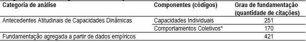 Partindo da compreensão de que o processo de codificação compreende a interpretação de dados e tem como objetivo a identificação de conceitos, assim como de suas respectivas propriedades e dimensões (Mendonça, Remonato, Maciel, & Balbinot, 2013), procedeu-se às etapas aberta, axial e seletiva para codificação dos dados (Corbin & Strauss, 1990; Böhm, 2004; Bandeira-de-Mello & Cunha, 2006). Finalizada a codificação, a teoria substantiva que emergiu do campo (421 citações) foi representada pela categoria “Antecedentes Atitudinais de Capacidades Dinâmicas”, sendo os componentes: (a) capacidades individuais e (b) comportamentos coletivos, como descrito na Tabela 3.