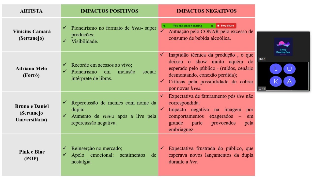 Mais adiante na videoconferência, Théo compartilhou sua tela com Luka, e apontou um relatório de impacto de algumas lives já realizadas por outros artistas. A exposição trouxe uma perspectiva mais organizacional para a decisão de adaptação a um novo cenário de transmissões ao vivo que, para o empresário, poderia ser uma alternativa para minimizar os atuais e incertos impactos trazidos pela pandemia ao mercado da música.