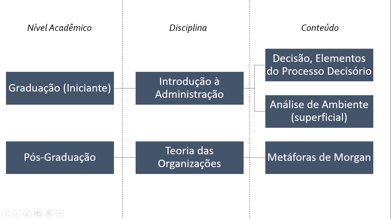 De toda forma, a priori, almejamos a aplicação na graduação, especificamente no primeiro período do curso de Administração, numa disciplina introdutória. O professor poderá trabalhar conceitos que envolvem: as variadas configurações de organizações, o ambiente (interno e externo) dessas organizações, bem como noções introdutórias ao processo decisório (decisão programada e não programada, abordagem racional tradicional, perspectiva da racionalidade limitada).