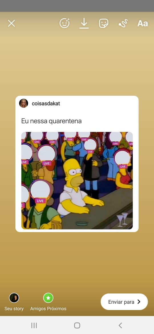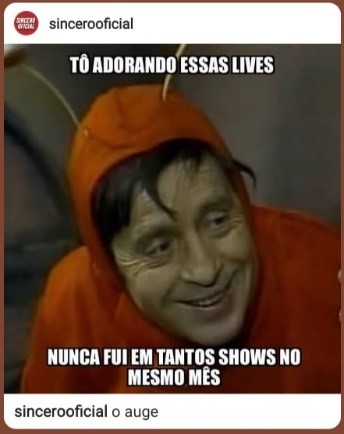 No que diz respeito à indústria musical, o isolamento social acabou por inspirar um novo jeito do público se manter conectado aos seus artistas preferidos: live streaming. As “lives” começaram como propostas despojadas para entreter os fãs, mas, em pouco tempo transformaram-se em grandes eventos patrocinados. As transmissões ao vivo se tornaram tão comuns e constantes que esse fato motivou o compartilhamento de diversos memes a respeito.