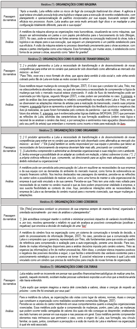 Nas situações descritas no caso, algumas metáforas trabalhadas por Morgan (2007) estão presentes e são apresentadas na Tabela 1, como possível parâmetro de resposta para a questão 2. Porém, a capacidade de interpretação do aluno pode vislumbrar análises e trazer metáforas não apresentadas nessas notas de ensino. Cabe ao professor analisar os argumentos utilizados pelo aluno para alcançar determinada interpretação e indicação da metáfora.