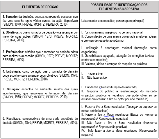Herbert A. Simon - Nobel de Economia em 1978 e um dos precursores da Teoria das Decisões – aponta seis elementos clássicos de toda decisão, seja ela programada ou não, a saber: tomador da decisão, objetivos, preferências, estratégia, situação e resultado (Simon, 1970). A Tabela 2 apresenta uma possibilidade de visualização desses elementos de decisão na narrativa e esta pode ser utilizada pelo(a) professor(a) como parâmetro para avaliação das respostas dos alunos.