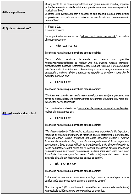 No entanto, o surgimento de um contexto pandêmico gerou uma crise mundial, impactando a indústria da música de diversas formas; uma delas foi a popularização um novo formato de produção musical (as “lives”[1]). Toda essa situação poderia acabar por invalidar os objetivos de curto prazo de Luka que, juntamente com o pessoal da sua agência, precisava avaliar as possíveis consequências envolvidas na decisão de aderir ou não à realização de uma “live”, tendo que desenvolver potencialmente novas habilidades para encarar esse cenário.