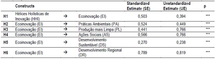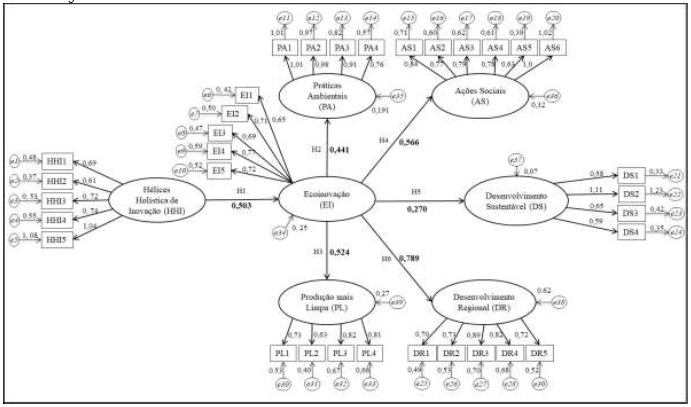Resultados: os testes de hipóteses indicam que as relações entre hélices holísticas de inovação e ecoinovação (H1), ecoinovação e práticas ambientais (H2), ecoinovação e ações sociais (H4) e ecoinovação e desenvolvimento regional (H6) são considerados de alta intensidade (>0,5), a relação entre ecoinovação e produção mais limpa (H3) é de moderada intensidade (>0,3 e <0,5), entretanto, a relação de ecoinovação e desenvolvimento sustentável (H5) é de baixa intensidade (<0,3), contudo as seis hipóteses da pesquisa foram confirmadas.