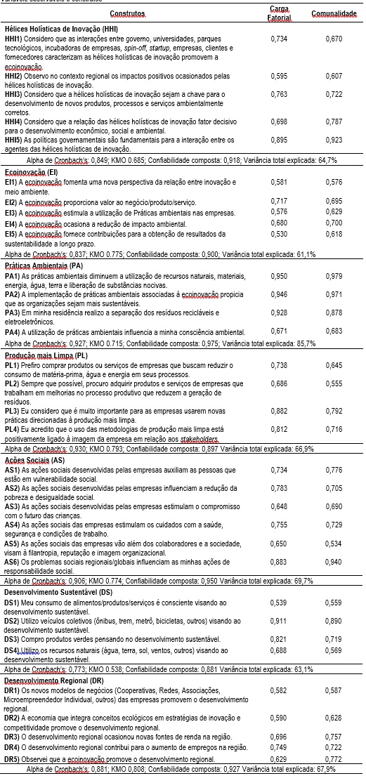 A validação da escala, variáveis observáveis e construtos ocorreu com a aplicação da AFE e confiabilidade composta, seguindo os preceitos de Fornell e Larcker (1981), Marôco (2010) e Hair Jr. et al. (2013). No cálculo da AFE (Tabela 1), utilizou-se a análise de componentes principais, com o uso da Rotação Varimax, que agrupou as variáveis observáveis nos sete construtos (Hélices Holísticas de Inovação – HHI, Ecoinovação – EI, Práticas Ambientais – PA, Produção mais Limpa – PL, Ações Sociais – AS, Desenvolvimento Sustentável – DS e Desenvolvimento Regional – DR), com 71,91% de variação explicada acumulada dos dados de todas as variáveis observáveis. Observa-se, na Tabela 1, que a variação explicada de cada construto foi superior a 61%, o que é superior ao recomendado (>60%) por Hair Jr. et al. (2013).