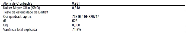 Perante o exposto, os testes estatísticos para todas as variáveis observáveis apresentaram valores significativos (Tabela 2), ou seja, ficaram dentro dos parâmetros sugeridos por Hair Jr. et al. (2013), assim como a Variância total explicada é de 71,9%. Perante o exposto, a Tabela 2 apresenta os testes: Alpha de Cronbach’s; KMO; Teste de esfericidade de Bartlett; Qui-quadrado aprox.; df; Sig.; e variância total explicada.