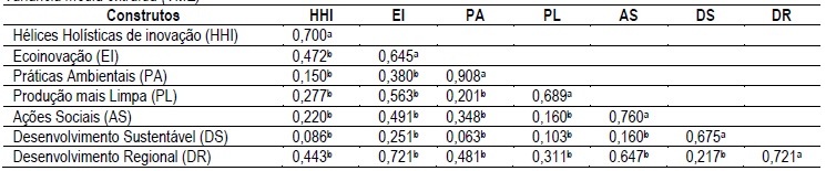 A Tabela 3 demonstra que, em todos os construtos, a VD é menor que a VC (HHI 0,700., EI 0,645ª, PA 0,908ª, PL 0,689., AS 0,760., DS 0,675. e DR 0,721ª).