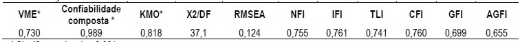 O cálculo da confiabilidade composta do conjunto de todas as variáveis resultou em de 0,989, assim a VME de 0,730, com relação à confiabilidade composta de cada construto (Tabela 1) ficaram com valores superiores ao recomendado (>0,7) por Hair Jr. et al. (2013).