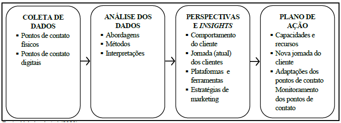 Holmlund et al. (2020) introduzem um framework de experiência do cliente associado ao Big Data Analytics (BDA). Este modelo descreve quatro arranjos necessários para a gestão da experiência de clientes: (i) a coleta de dados implica na tentativa ativa e incessante de coletar dados dos clientes nos pontos de contato físicos e digitais, a fim de compreender seus comportamentos e participações; (ii) a análise dos dados procura empregar BDA para analisar dados da experiência do cliente. O BDA é capaz de realizar quatro tipos de análises: descritiva, inquisitiva (diagnóstica), preditiva e prescritiva; (iii) as perspectivas e insights se referem a compreender o comportamento e jornadas dos clientes, as plataformas e ferramentas e, ainda, as estratégias de marketing empregas pela empresa; (iv) o plano de ação visa concentrar a execução da experiência do cliente quanto ao aprimoramento de recursos, construção e adaptação de novas jornadas e, também, ajustes e monitoramento dos pontos de contato do cliente (ver Figura 3). Para os autores, a experiência do cliente deve fazer parte da cultura da empresa. Contudo, os dados devem ser uma extensão do gerenciamento de experiências do cliente, com vistas a desenhar soluções estratégicas mais aderentes aos clientes.