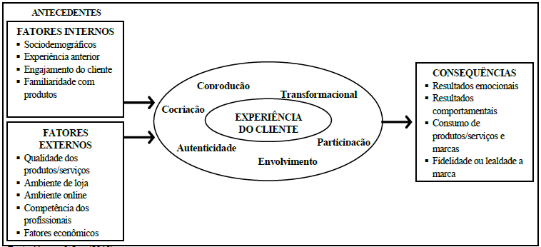 Hwang & Seo (2016) apresentam um framework de gestão de experiência do cliente baseado no setor de hospitalidade e turismo. Este modelo é sustentado por três perspectivas: (i) antecedentes da experiência, que foram determinadas como sendo fatores internos e externos; (ii) a experiência do cliente, com elementos que são geradores de valor ao cliente, entre os quais se destacam a cocriação e a coprodução de serviços; e (iii) e as consequências ou resultados das experiências, que podem ser tanto positivas quanto negativas, no caso, resultados emocionais e comportamentais, consumo de produtos e serviços e, também, fidelidade ou lealdade à marca (ver Figura 4). Os autores buscam, por meio deste modelo, conhecer e debater três características da experiência do cliente: (i) retorno das experiências ao cliente; (ii) participação do cliente do processo de serviços; e (iii) envolvimento dos stakeholders.