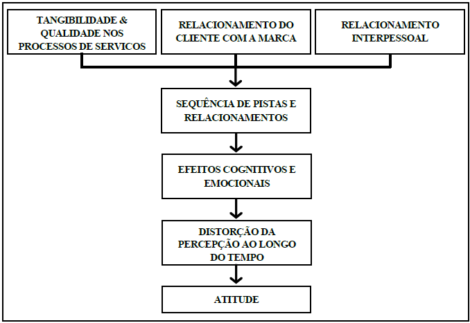 O último framework, concebido por Palmer (2010), traz uma proposta integrada que começa com estímulos básicos ao cliente: tangibilidade e qualidade nos processos de serviços (SERVQUAL), relacionamento do cliente com a marca e relacionamento interpessoal – imagem da marca ao cliente. Em seguida, a atitude do cliente acerca da experiência promovida pela empresa passa pela sequência de “pistas” para a construção de relacionamentos que buscam conduzir aos efeitos, tanto cognitivos quanto emocionais, contornando eventuais percepções negativas ou distorções ao longo do tempo (ver Figura 5). O autor visa, assim, explicar que a experiência do cliente poderá resultar na ponderação das atitudes ao longo do tempo na sua relação (cliente) com o marca (ou empresa).