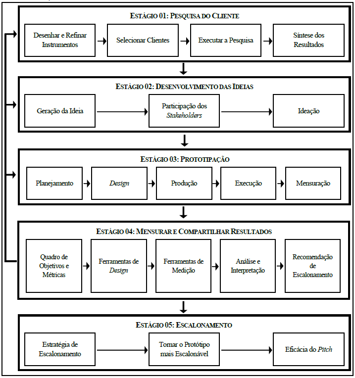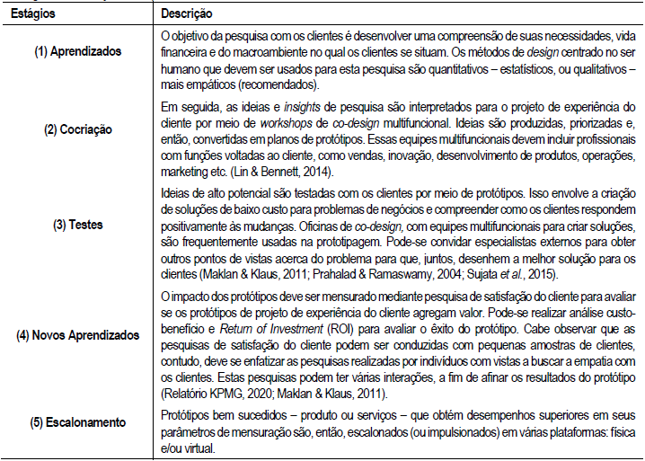 Nota-se que o desenho de uma experiência do cliente passa por uma série de estágios. Na visão de Holmlund et al. (2020), a experiencia do cliente tem seis estágios: estratégia, avaliação, pesquisa, decisão, implementação e aprendizados. Contudo, os autores deste ensaio acreditam que há cinco etapas que compreendem um projeto de experiência do cliente, e todos ocorrem interativamente: (ver Figura 6) visão macro e geral, e (Figura 7) visão detalhada do framework (abordada no tópico 4 “Estágios de um Projeto de Experiência do Cliente”). Há, ainda, o Quadro 1, que descreve cada um dos estágios. Cabe ressaltar que nem todos os estágios são requeridos para os projetos de experiência do cliente, uma vez que há projetos que podem precisar apenas de pesquisa com clientes, enquanto outros podem ter apenas demandas de prototipagem. Por fim, este framework é baseado nos princípios de Lean Startup, proposta que vem sendo utilizada em projetos de inovação que integrem design thinking, user experience (UX), canvas de negócios, minimum viable product (MVP) e growth hacking.