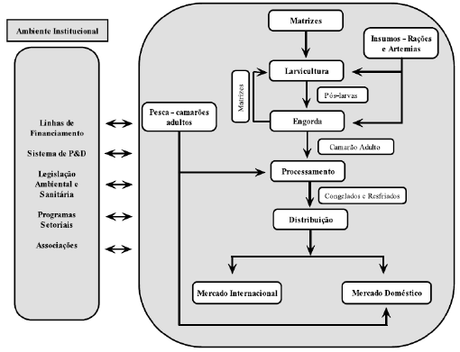 Em 2018, a produção brasileira de camarão marinho cultivado foi de, aproximadamente, 77 mil toneladas, gerando uma receita total de R$ 3 bilhões para a indústria nacional (ABCC, 2020). A Figura 4, a seguir, mostra um esquema da cadeia produtiva da carcinicultura marinha no Brasil.
