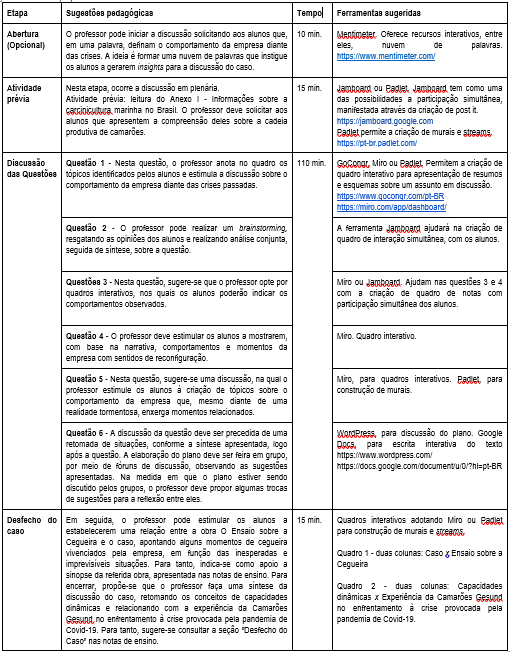 Para facilitar a interação durante as aulas, especialmente na modalidade on-line são sugeridas, no decorrer da análise do caso, algumas ferramentas de interação. Considera-se adotar, mesmo em aulas presenciais, em que, geralmente, os alunos estão com celulares e alguns, notebook, a participação simultânea suportada pelas ferramentas mencionadas, o que irá tornar a aula mais dinâmica e atrativa para os discentes.