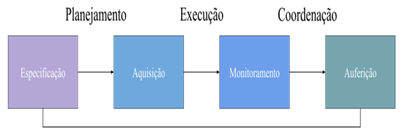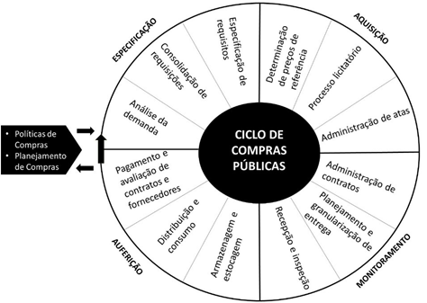 O ciclo de compras públicas (Figura 3) tem início com o dimensionamento da demanda, perpassando por um caminho de aglomeração de atos administrativos oriundos de diversos setores estratégicos, a exemplo de especificação e padronização, coleta de preços praticados no mercado para embasar o custo estimado, a execução do procedimento licitatório, até a conclusão com a avaliação dos contratos junto aos fornecedores. Nesse diapasão, incorporam-se questões jurídicas, fiscais, de gestão, logística, controle e política de incentivos (FERRER & SANTANA, 2015).