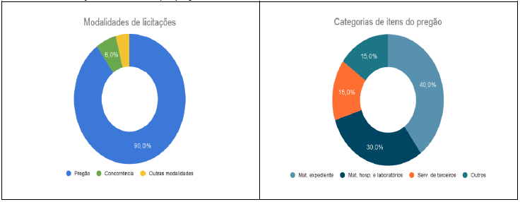 Após um levantamento nos processos licitatórios, constatou-se que o pregão, por exemplo, era a modalidade de licitação predominante, presente em mais de 90% dos casos. Ou seja, excetuando-se obras, praticamente todo o restante ocorria por meio dessa modalidade. Paulo ficou surpreso ao saber que isso envolvia desde a aquisição de hortifrutigranjeiros, até a compra de veículos automotores, perpassando por material de expediente para o funcionamento da máquina administrativa, medicamentos, materiais e equipamentos médico-hospitalares para o Hospital Universitário. Também eram realizados pregões visando à contratação de serviços contínuos e não contínuos para todas as áreas da administração, como tecnologia da informação, contratação de instituição financeira, higienização e limpeza, vigilância, manutenção de equipamentos, dentre outros.