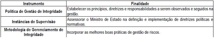O Manual da Gestão de Integridade, Riscos e Controle Interno (GIRC) do Ministério do Planejamento, Desenvolvimento e Gestão (MPDG) contempla que, no ambiente de trabalho, muitas vezes, as organizações se deparam com fatores internos e externos que tornam incerto o êxito do atingimento dos objetivos do projeto ou da atividade que se encontra em desenvolvimento. Independentemente da área em que se atua, os riscos podem afetar o andamento da ação, levando-a a uma direção completamente diferente daquela inicialmente planejada. São instrumentos desse modelo, a política de gestão de integridade, as instâncias de supervisão e a metodologia de gerenciamento de integridade (MPDG, 2017).