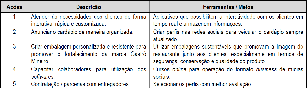 Os gestores do Gastrô Mineiro precisam compreender que a forma como a empresa compete no mercado, suas metas, políticas e a relação com o ambiente, são essenciais para o desenvolvimento da estratégia competitiva (Porter, 2005). No caso do Gastrô Mineiro, o professor pode ainda sugerir uma análise das ações complementares ao sistema de delivery, Figura 3, avaliando em conjunto com os alunos se as ações delineadas por Pedro são suficientes para enfrentar o ambiente de mudanças que vivencia o restaurante de dona Zizi.