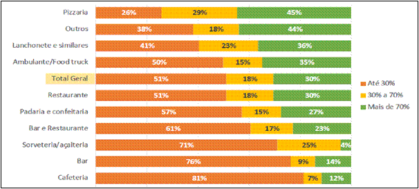 Pedro constatou também que a delivery teve participação bastante relevante no cenário da pandemia, conforme a Figura 6. Em 30% do orçamento do segmento, o sistema representa uma participação acima de 70% (Abrasel, 2020). Para Pedro, era evidente que o Gastrô Mineiro estava em desvantagem utilizando apenas o atendimento presencial, pois a pesquisa também mostrava que 50% das empresas que tiveram seu faturamento aumentado na pandemia apostaram em delivery, o que possibilitou a expansão de suas vendas.