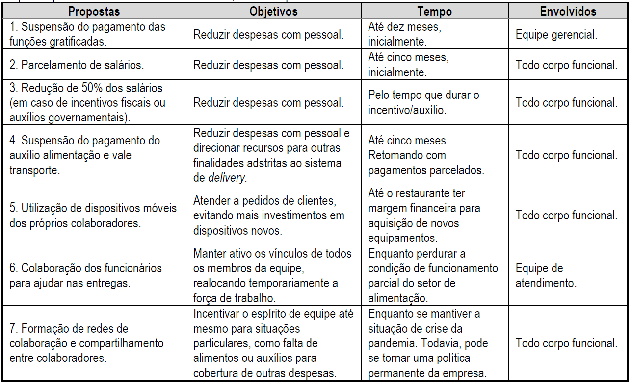 Pensando nisso, Pedro não desistiu de sua ideia e decidiu se reunir com os colaboradores do Gastrô Mineiro, sem a presença de dona Zizi. Antes, ele elaborou uma apresentação com gráficos indicativos da queda do faturamento no primeiro semestre do ano de 2020, conforme a Figura 2, bem como uma lista de propostas (Figura 7). O objetivo de Pedro era a manutenção da empregabilidade de seus colaboradores, mas com a redução de custos, para canalizar recursos rumo à implantação do sistema de delivery. Sem demissões, o administrador da família sabia que teria mais probabilidades de obter a chancela de sua matriarca.