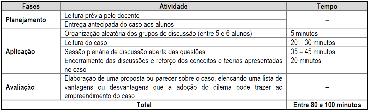 A condução do caso pelos envolvidos pode variar. Contudo, sugere-se que o professor faça uma análise minuciosa do conteúdo apresentado, identificando potenciais temas que serão abordados em sala de aula e considerando o tempo de aplicação da atividade, a sequência lógica das ações que adotará e o conteúdo da disciplina. Em seguida, o professor deverá enviar previamente o caso para os alunos, indicando as tarefas que serão trabalhadas durante a aula.