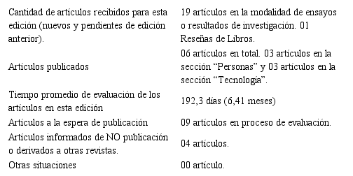 http://www.revistas.usach.cl/ojs/index.php/revistagpt . Por otra parte y en segundo lugar, señalar que a contar de la presente edición, en el cuadro que resume la cantidad de artículos recepcionados, en tránsito o en evaluación y los artículos rechazados, comenzaremos a informar también el tiempo promedio por cada edición que demora una propuesta de artículo en ser evaluado e informado a las respectivas autoras y/o autores para posteriormente, ser publicado[i]. Estamos claros que este es un punto crucial y muy sensible para las y los investigadores y académicos y hemos definido que comunicar los tiempos estimados de evaluación es un aporte a los procesos de transparencia de la revista y a generar expectativas más realistas en los y las autoras respecto de las fechas en las que se podría concretar su publicación.