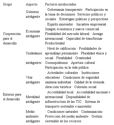 El siguiente paso de los municipios dadas las tendencias internacionales, será apropiarse de los conceptos de ciudad inteligente, explicada por Rózga Luter y Solleiro (2017:53) como “aquellas comunidades, vecindades, distritos, ciudades y regiones que tienen la habilidad para apoyar el aprendizaje, el desarrollo tecnológico y los procedimientos de información, y cuenta con los espacios digitales e instrumentos de procesamiento de información, transferencia de conocimiento y tecnología”. Otra definición de ciudad inteligente es “la ciudad que supera sus retos mediante la aplicación estratégica de bienes, servicios y redes tecnológicas para mejorar la calidad de vida y accesibilidad de sus habitantes, para proveer servicios a sus ciudadanos, gestionar su infraestructura y asegurar un desarrollo sostenible” (Güereca, 2018:18). La necesidad de la gestión tecnológica en los municipios es congruente con la tendencia mundial a la habilitación de ciudades inteligentes, en las cuales las tecnologías se integran transversalmente en las actividades cotidianas de la sociedad, en este sentido, es importante identificar los aspectos de éstas ciudades y sus factores involucrados, los cuales se muestran en la tabla 1, los que fueron reportados por Berra (2013), y las que se han dividido en dos grupos, aspectos de cooperación para el desarrollo y el entorno para el desarrollo.