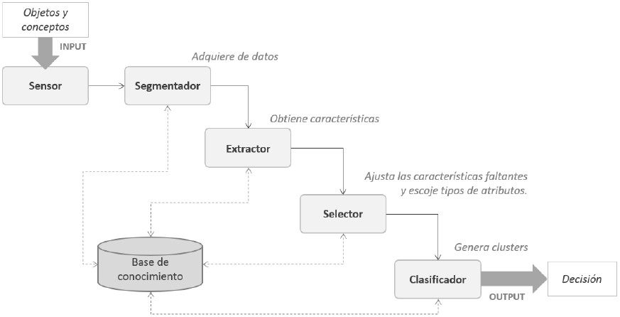 Elaboración propia a partir de Alba y Cid (2006), Bevilacqua (2012) y Kumar (2013).Inicialmente, el Sensor de un sistema de reconocimiento de patrones adquiere los datos del exterior, ya sea del mundo físico (a través de sensores electrónicos de medición) u otros sistemas. El Sensor debe contar con la capacidad de transformar las variables de entrada como variables de instrumentación en datos electrónicos procesables.