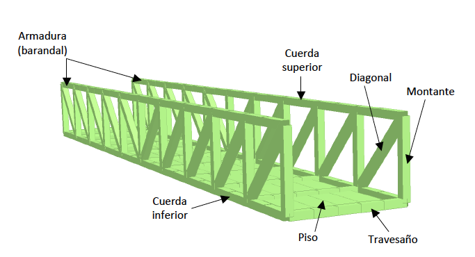 Cuerda superior Importar_tabla5265c64616 Cuerda inferior inferior Importar_tabla5265c64616 Travesaño Importar_tabla5265c64616 Diagonal Importar_tabla5265c64616 Montante Importar_tabla5265c64616 Piso Importar_tabla5265c64616 Armadura (barandal) Importar_tabla5265c64616