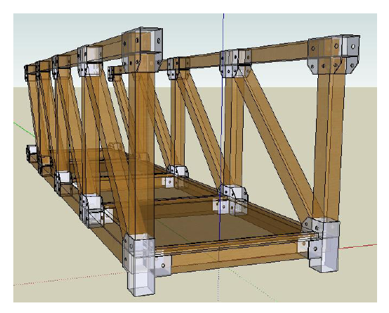 El puente se modula en tramos de un metro de longitud, conformado principalmente por dos armaduras que a la vez son los barandales con un metro de altura (figura 1); dichas armaduras se ensamblan en suelo firme antes de su montaje. Posteriormente, se lanzan las armaduras rigidizándolas con los travesaños, iniciando en un extremo del puente y ajustándolos hasta que todos los travesaños estén colocados en su lugar. Finalmente, se colocan tablas sobre ellos para obtener el piso del puente, con una separación entre ellas de 1 cm para permitir el paso de la lluvia y del aire, con el fin de mantener siempre seca la superficie de tránsito.